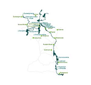 - Der Łąckie-See , Fläche 126,7ha, Länge 1,7km, Tiefe 15m. Im Osten ist der See mit dem Dybrzyk verbunden. Seine Ufer sind bewaldet und relativ hoch. Wir rudern am linken Ufer entlang.
