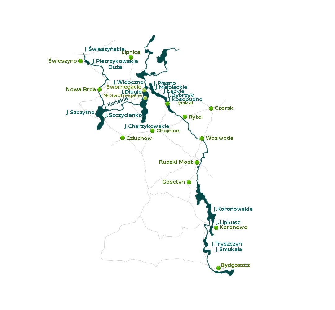Der Koronowskie-See ist ein Stausee und entstand 1956 nachdem der Staudamm und Wasserkraftwerk in Koronowo-Samiciążek gebaut wurde. Der See hat zahlreiche Buchten und reiche Uferlinie, seine Fläche beträgt 1.560ha, Tiefe 20m. Am See befinden sich viele Erholungsheime, Hütten, Gästehäuser. - 67 km