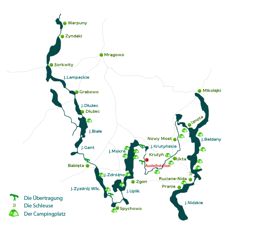 Wir setzen die Boote an der Brücke ein. Der Flussabschnitt, auch Spychowa Struga genannt, hat eine ziemlich reißende Strömung. Er mündet aber in Kürze in der Zdruzno-See. Wir halten uns an das rechte Ufer und fahren rechts in eine Bucht hinein. Der Uplik-See hat hohe mit Kiefern und Fichten bewachsene Ufer. Am rechten Ufer, etwa in der Mitte des Sees befindet sich ein Naturschutzgebiet, ein Nistplatz der Fischreiher. Hinter der Straßenbrücke erreichen wir den Mokre-See, einen der tiefsten und größten entlang der Route. Mit seinen zahlreichen kleinen Inseln ist der Mokre See ein Vogelparadies. Die Ufer sind abwechslungsreich mit Bäumen verschiedener Art bewachsen und der sandige Boden lädt zum Baden ein. Im Naturschutzgebiet am rechten Ufer „ Królewska Sosna“ findet man über 200 Jahre alten Kiefer als auch einige Denkmalbäume. Etwa 1 km vor dem nördlichen Ende des Sees befindet sich eine Bucht, die an einer Sperre endet - hier muss man das Kanu mal tragen, allerdings nur 20 m weit. Dann haben wir das Südufer des mitten im Wald gelegenen Krutynski-Sees vor sich. Hier beginnt der schönste Abschnitt der Krutynia-Route. Die Ufer wirken unberührt mit vielen umgestürzten Bäumen. Wir erreichen den eigentlichen Fluss Krutynia. Der malerische Fluss gab den Namen für die ganze Route. Die reißende Strömung, breites Flussbett, und das durchsichtige Wasser machen die Strecke besonders. Die Tour endet im Dorf Krutyn (Krutinnen) hinter der Brücke an der linken Seite.